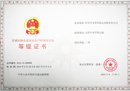 2014年5月,公司安全生產(chǎn)標(biāo)準(zhǔn)化建設(shè)工作,順利通過(guò)了交通部長(zhǎng)江航務(wù)管理局委托安徽省航運(yùn)商會(huì)考評(píng)機(jī)構(gòu)的達(dá)標(biāo)考評(píng);6月10日,長(zhǎng)江航務(wù)管理局正式向公司頒發(fā)了交通運(yùn)輸企業(yè)安全生產(chǎn)標(biāo)準(zhǔn)化二級(jí)達(dá)標(biāo)證書(shū),公司成為安徽省第一家一次性通過(guò)達(dá)標(biāo)考評(píng)的水路普通貨物運(yùn)輸企業(yè),是長(zhǎng)航系統(tǒng)通過(guò)達(dá)標(biāo)考評(píng)的第一家水路普通貨物運(yùn)輸企業(yè)二級(jí)達(dá)標(biāo)單位。