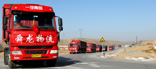 鞭炮轟響,汽笛長鳴,“舜龍物流”車隊,披紅掛花,滿載烏金,緩緩駛出,全場歡聲雷動、振奮人心。